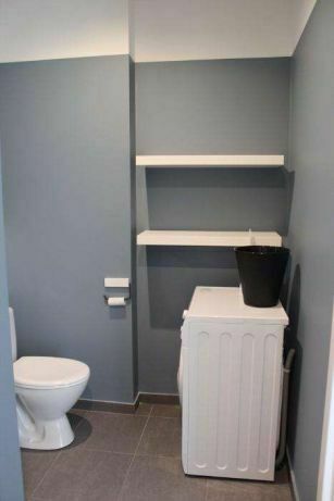 Łazienka posiada prysznic, pralkę, umywalkę i toaletę.